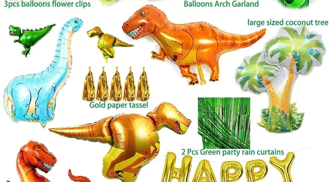 Lass die Urzeit wieder aufleben und feiere mit einer Dekoration, die kleine Dino-Fans begeistert! Unsere imposante 5 Meter lange Ballongirlande bringt mit kräftigen Farben und coolen Formen richtig Stimmung in den Raum. Dazu gibt es eine stilvolle Tischdekoration mit passenden Tellern, Bechern, Servietten und passenden Tischsets – alles abgestimmt auf das aufregende Dinosaurier-Motto. Die große Zahlenballonfigur in Gold oder Silber setzt einen eindrucksvollen Akzent und sorgt für die perfekte Foto-Kulisse. Für jeden kleinen Dino-Forscher gibt es zusätzlich einen niedlichen Dino-Formballon zum Mitnehmen. Natürlich übernehmen wir die komplette Organisation: von der Lieferung über den Aufbau bis zur Endmontage. So kannst du dich ganz auf die strahlenden Gesichter deiner Gäste konzentrieren.